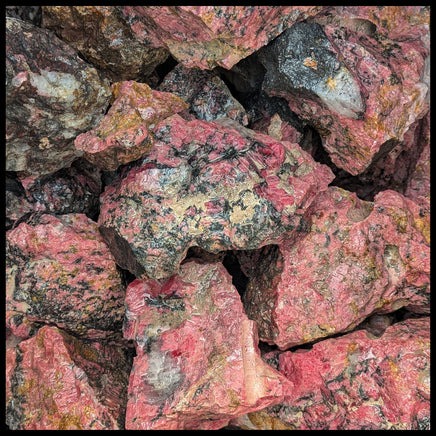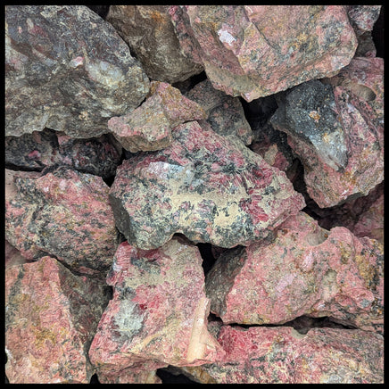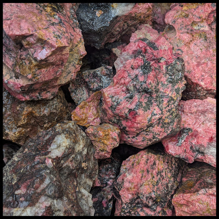 This Rhodonite from South Africa has a pink with brown inclusions, black manganese oxide patterning, and some spots of white calcite. Some pieces have drill marks from the mining process.