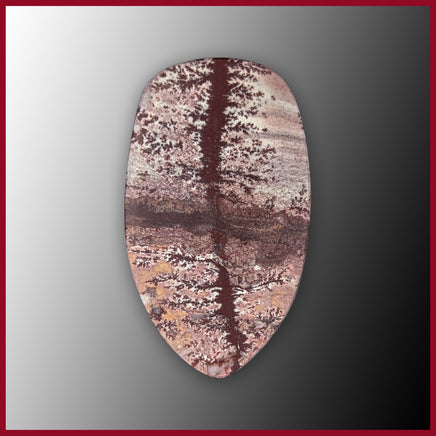 This Sonora Dendritic cabochon has a smooth matte finish. It features various shades of mauve patterning over an off-white background, with parallel bands contrasted with a thick line of dendrites interrupting them through the middle of the cab.