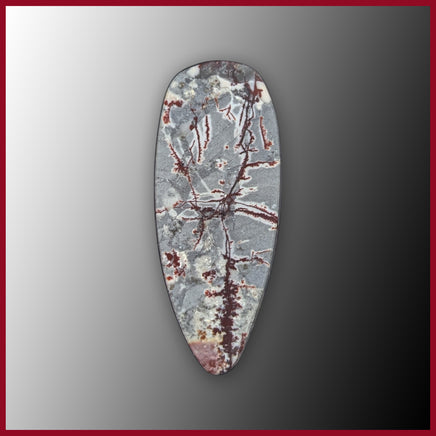 This Sonora Dendritic cabochon has a smooth matte finish. It features a gray background with hints of white and mauve, with dark maroon dendrites.