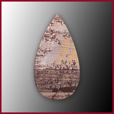 This Sonora Dendritic cabochon has a smooth matte finish. It features a sandy and pale mauve background with scenic parallel bands, and dark maroon dendrites.