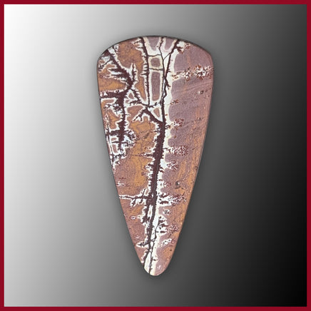 This Sonora Dendritic cabochon has a smooth matte finish. It features a deep sandy and mauve background with brecciation and dendritic patterning in dark maroon and outlined in white.