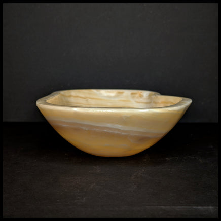 This handcrafted stone bowl was created from one solid piece of Mexican Onyx (a type of banded calcite). It shows translucent yellow to white concentric banding, and is polished smooth with a flat top edge and base.