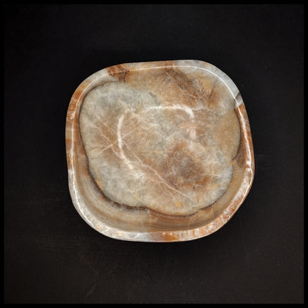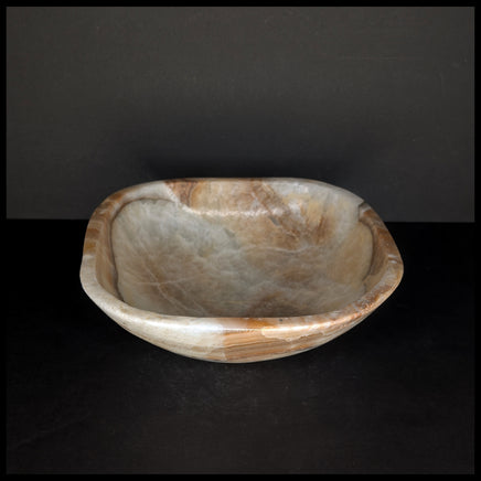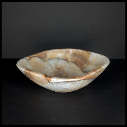 This handcrafted stone bowl was created from one solid piece of Mexican Onyx (a type of banded calcite). It shows translucent and beige calcite with darker brown bands, and is fully polished with a flat base and top edge.