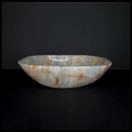 This handcrafted stone bowl was created from one solid piece of Mexican Onyx (a type of banded calcite). It shows horizontal banding in translucent to off-white and golden orange calcite, and is fully polished with a flat base and top edge.