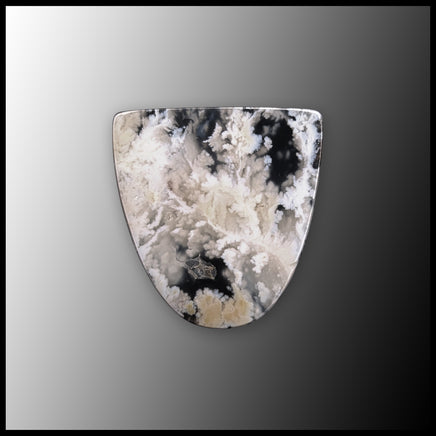 This White Plume Agate comes from Eastern Oregon and is found along Stinking Water Creek. It shows translucent agate with white, feathery, plumes. This cabochon is a doublet with a beautiful polished plume agate top and backed with black basalt.