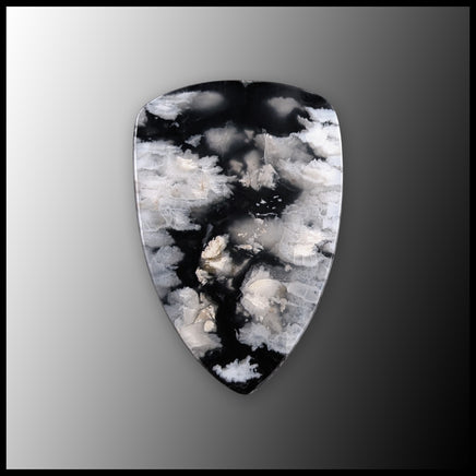 This White Plume Agate comes from Eastern Oregon and is found along Stinking Water Creek. It shows translucent agate with white, feathery, plumes. This cabochon is a doublet with a beautiful polished plume agate top and backed with black basalt.