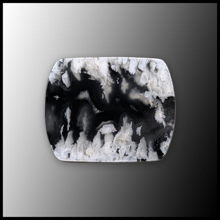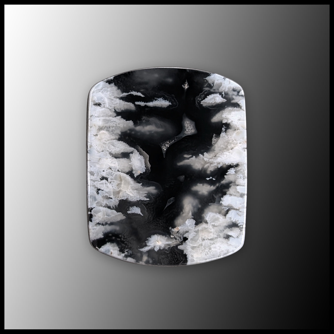 This White Plume Agate comes from Eastern Oregon and is found along Stinking Water Creek. It shows translucent agate with white, feathery, plumes. This cabochon is a doublet with a beautiful polished plume agate top and backed with black basalt.