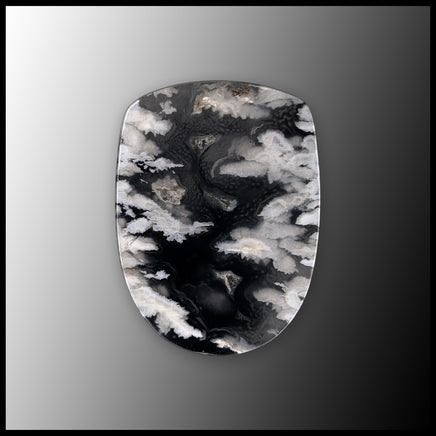 This White Plume Agate comes from Eastern Oregon and is found along Stinking Water Creek. It shows translucent agate with white, feathery, plumes. This cabochon is a doublet with a beautiful polished plume agate top and backed with black basalt. It has a few tiny pockets of sparkling druzy.