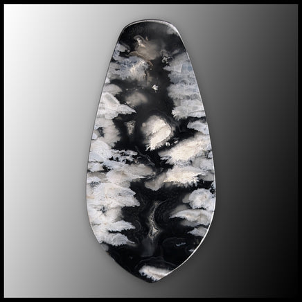 This White Plume Agate comes from Eastern Oregon and is found along Stinking Water Creek. It shows translucent agate with white, feathery, plumes. This cabochon is a doublet with a beautiful polished plume agate top and backed with black basalt.