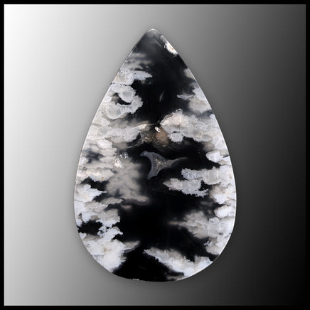 This White Plume Agate comes from Eastern Oregon and is found along Stinking Water Creek. It shows translucent agate with white, feathery, plumes. This cabochon is a doublet with a beautiful polished plume agate top and backed with black basalt.