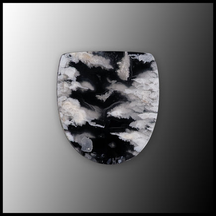 This White Plume Agate comes from Eastern Oregon and is found along Stinking Water Creek. It shows translucent agate with white, feathery, plumes. This cabochon is a doublet with a beautiful polished plume agate top and backed with black basalt.