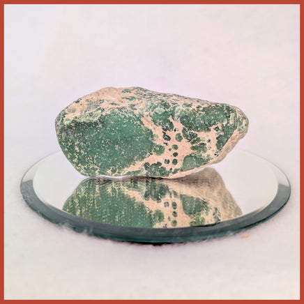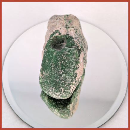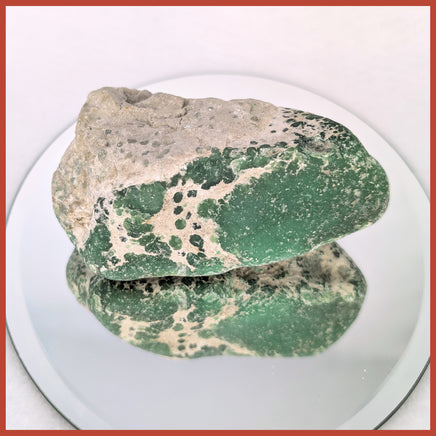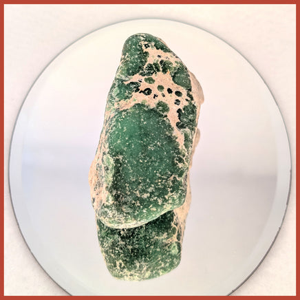 This piece of Variscite is in its natural rough shape. It shows solid gemmy green with some chalky inclusions and one side, with an outer layer of gray matrix.