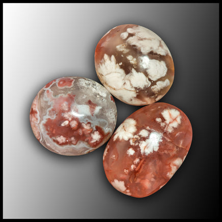 Flower Agate polished pebbles feature creamy-pink translucent agate with white and pink opaque floral-like inclusions. The pebbles are fully polished and are approximately 1 1/2" to 3" in size.