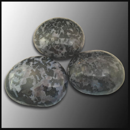 Indigo Gabbro polished pebbles display a black and blue-gray coloring in a brecciated pattern.