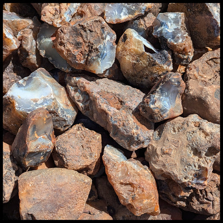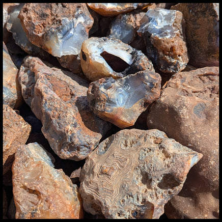 From Madagascar. This nodular agate is fairly solid with few fractures, and is slightly river worn. They can contain banding, dendrites, tube formations, and occasionally sagenite. Each one is a surprise to cut. Coloring is typically light, with whites, blues, and clear agate with contrasting black or brown.
