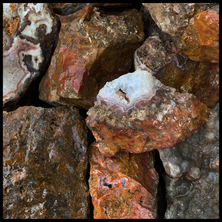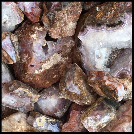 Agua Nueva Agate #2 Grade is vein formation Agua Nueva Agate from Chihuahua, Mexico. It is mostly moss agate, with some fortification banding. The banding can contain pink, white, lavender, or yellow, and the moss is golden yellow and dark red. This material is suitable for both cabbing and specimens.