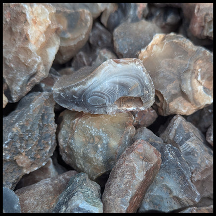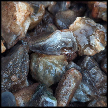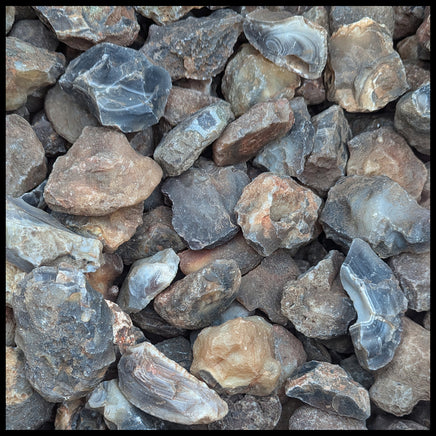 From Africa, Botswana Agate is known for its tight banding and often contains parallax or "shadow banding." Botswana Agate coloring is primarily white and black but rosy pinks and pale orange agate coloring is also possible. This material is partially broken, and can be used for small specimens, cabs, or tumbling material.