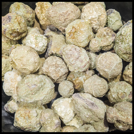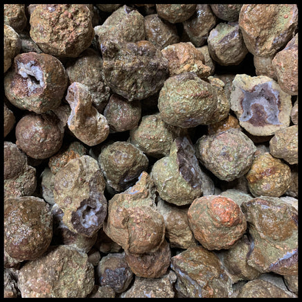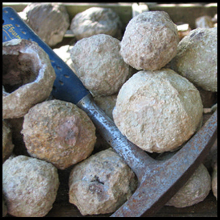 Candy Geodes from Mexico with a round, yellow-green exterior. The inside has light blue-grey spikey quartz crystals and is fairly hollow.