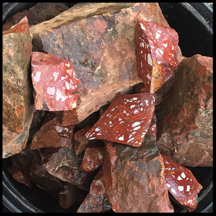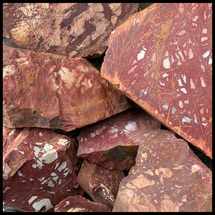 This jasper contains predominately blood red jasper with pale blue jasper. Occasionally pink and gold can be found throughout the rock as well. This material is similar to Noreena jasper from Australia, but it is less fractured, more solid, and can be found in much larger chunks. Because this material does contain natural fracturing, it lends itself as a wonderful cabbing rock.