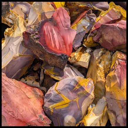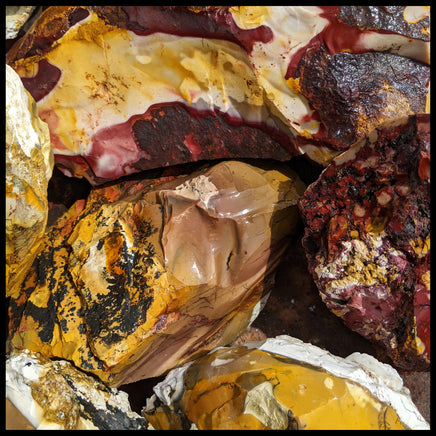 From Australia, Mooka Jasper has a wide range of colors: white, cream, gold, orange, red, and purple jasper. Great for cabbing and specimens.