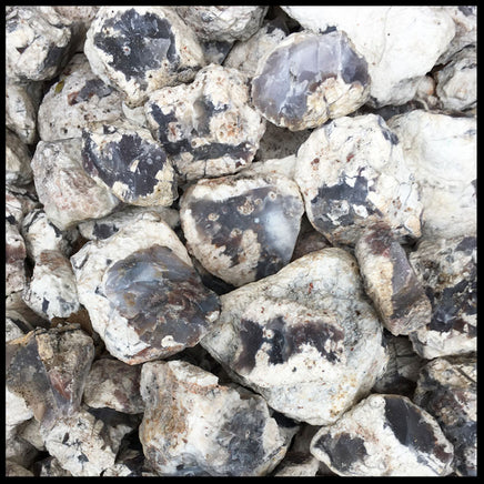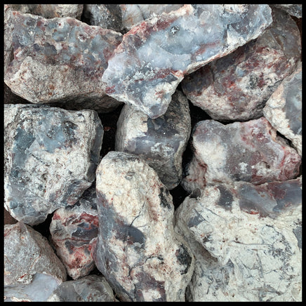 Salvia Purple Chalcedony #3 features Salvia Chalcedony in dark to grayish purples with red, black and green inclusions in a chalky white matrix. Pieces range from 1 inch to 10 inches. Great cabbing material with great pattern possible.