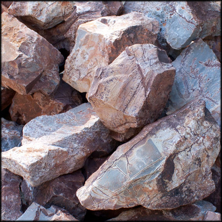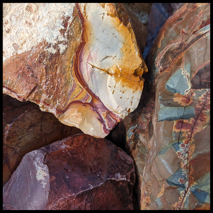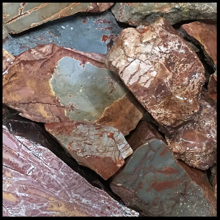 This unique blend of aspects of the famous Owyhee Picture Jasper and dendritic Apache Sage, can have scenic pictures with maroon dendrites on a blue and tan landscape, maroon plumes with a pink background, or an almost Hickoryite orange and yellow swirl behind one of the aforementioned patterns. This material is softer than a jasper and is often satin finished. It can take a fairly high polish with some work.