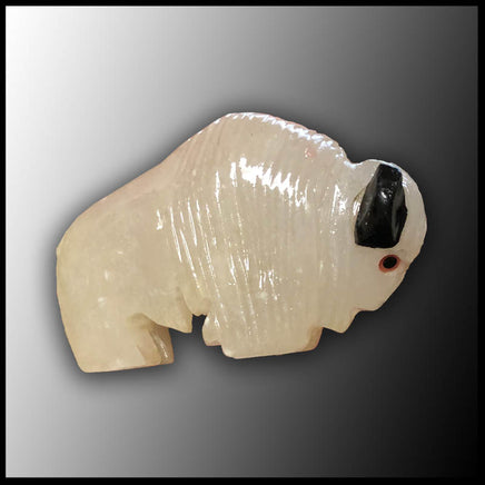 A roaming Bison, or American Buffalo, carved out of cream and black onyx with bright brown eyes.
