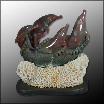 These dolphins are carved from a single piece of Bloodstone, and mounted on a base of Coral and Black Onyx.