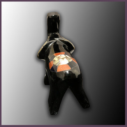 Black obsidian elephant features a large elephant carved from black obsidian and inlaid with different stones and shell. Inlaid stones include goldstone, blue goldstone, sheen obsidian, mahogany obsidian, turquoise, moss agate, unakite, various jaspers, and abalone shells.