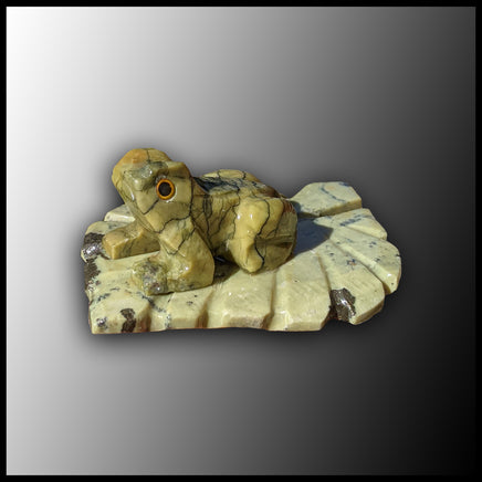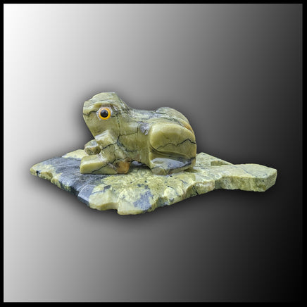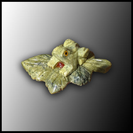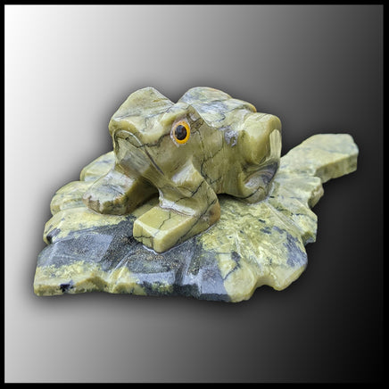 Carving of a frog sitting on a leaf in light green Serpentine with either blue or yellow eyes.