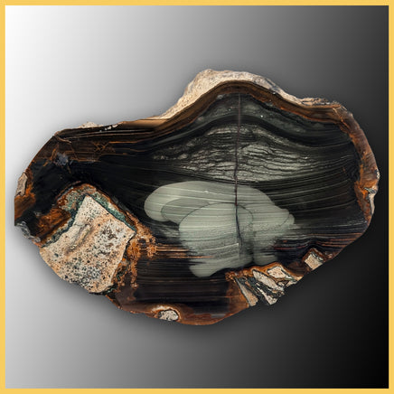 Blue Mountain Picture Jasper, from Oregon, specimen in shades of dark blue-green jasper that appears almost black, with bits of golden orange and khaki tan; featuring repeated egg patterning and horizontal bands.