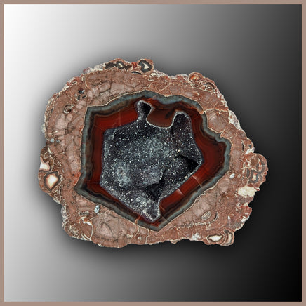 Baker Ranch Thundereggs come from Luna County, New Mexico. This polished specimen features tan rhyolite surrounding banded agate in shades of grey and deep red, and has a geode center of smoky druzy crystals.