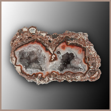 Baker Ranch Thundereggs come from Luna County, New Mexico. This polished specimen features tan rhyolite surrounding two openings of crystals and druzy tinged with peach and outlined with agate.