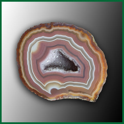 This is a polished specimen featuring yellow and pink agate with a druzy pocket center.