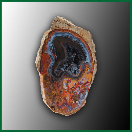 This is a polished specimen featuring a dark crystal center surrounded by white, brown, and orange banding and a mossy lower half in gray, yellow, and orange.