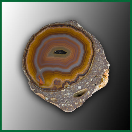 This is a polished specimen featuring yellow, orange, and blue-gray banded agate.