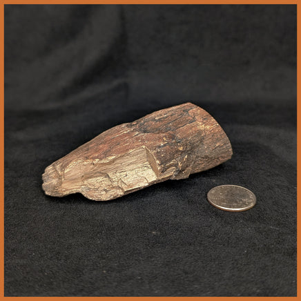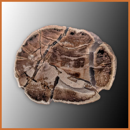 This petrified limb cast comes from a petrified wood collecting area across central western Wyoming. It has one polished end that the classic wood grain pattern in brown, with brecciation lines filled with translucent agate. The outer crust has very well-preserved bark texture in an irregular driftwood shape.