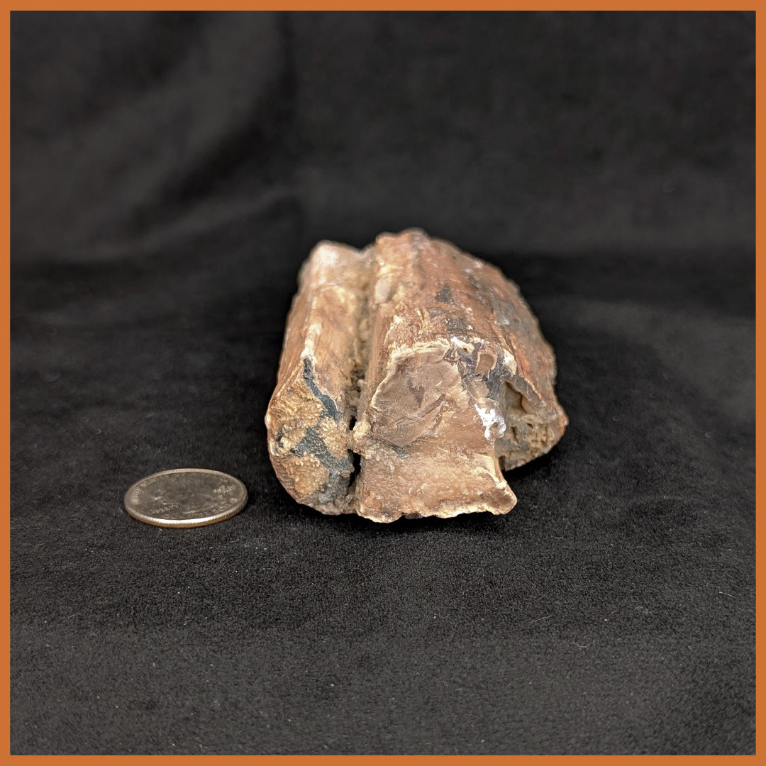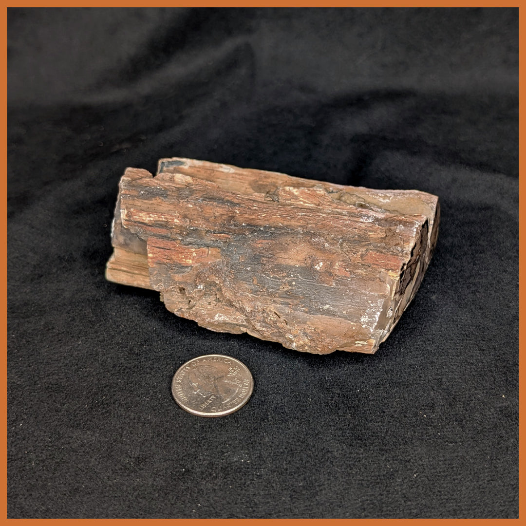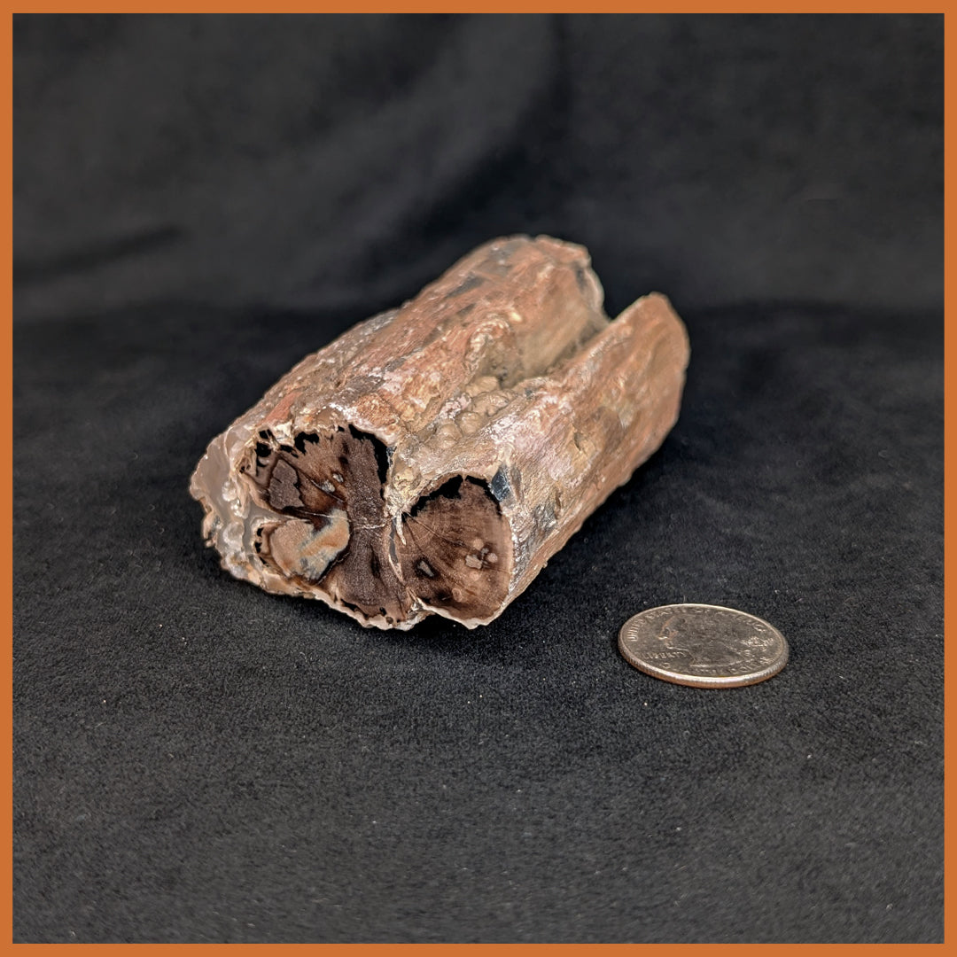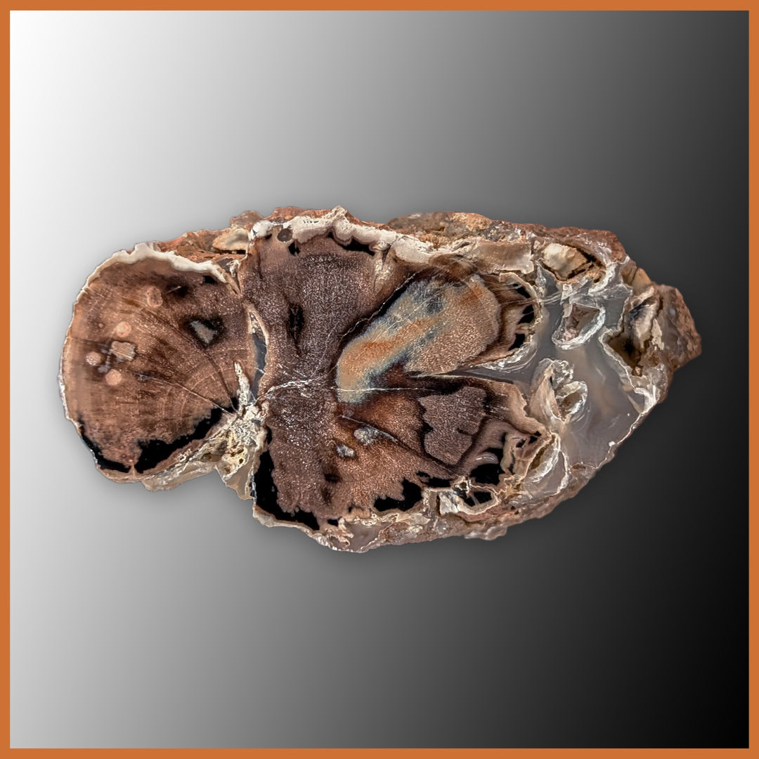 This petrified limb cast comes from a petrified wood collecting area across central western Wyoming. It has one polished end that shows brecciated concentric wood graining in varying shades of brown, black accents, and a section of translucent agate on one edge. The outer crust has very well-preserved bark texture with evidence of bore holes from worms and insects.