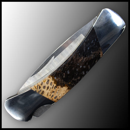 These stone-handled folding knives were crafted by Jake Rankin using high quality blades from Buck Knives. The handle of this knife is made from intricate tan and brown Pocket Rot Petrified Wood from Indonesia. The blade is a drop point 500 Duke Knife, made from high quality steel with a traditional lockback design.