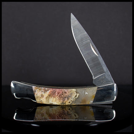These stone-handled folding knives were crafted by Jake Rankin using high quality blades from Buck Knives. The handle of this knife is made from Regency Rose Plume Agate from the Graveyard Point mining area in Oregon. It is a semi-translucent yellow agate with beautiful plumes in shades of yellow, orange, and pink. The blade is a drop point 501 Squire™ Knife, made from high quality steel with a traditional lockback design.