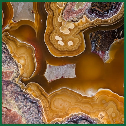 This Laguna Agate polished specimen features a mossy pinkish matrix with golden yellow lacey, banded agate, with two quartz centers.