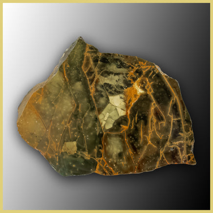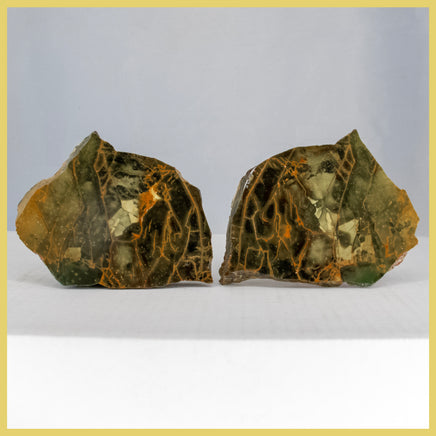 Morrisonite (or Morrison Ranch Jasper) from Oregon in the Owyhee region. This specimen pair has a very fine polish featuring healed brecciation filled with golden orange jasper over a backdrop of earthy, dark olive green.