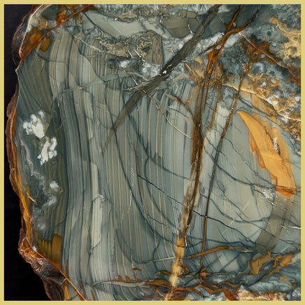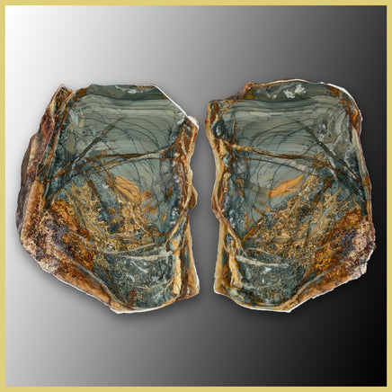 Morrisonite (or Morrison Ranch Jasper) from Oregon in the Owyhee region. This polished specimen pair features overlaying patterns of bands, streamers, and 'spiderwebbing' in dark blue-green and golden jasper.