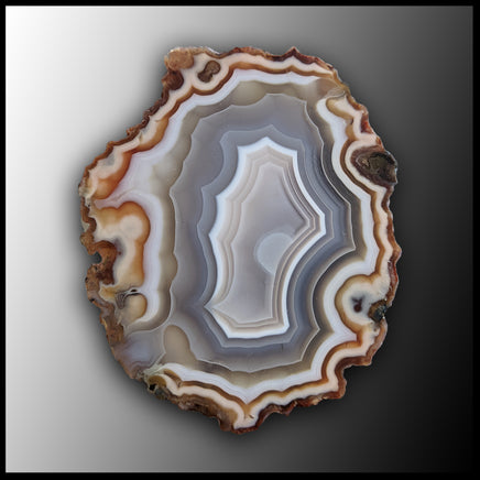 This specific specimen is from Aouli, Morocco. Moroccan agates come in a wide variety of colors and patterns, and can be found in locations all across Morocco. It is known for its brilliant colors and intriguing patterns, it makes superb cabochons and takes an exceptional polish. The great variety makes it an excellent addition to any collection.