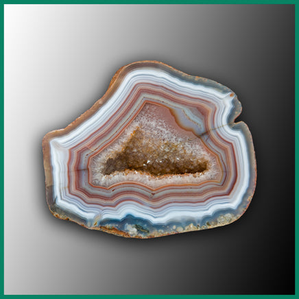 Malawi Agate polished specimen, features orange, white, and blue-grey banding with a crystal-filled vugg in the center. It's pair is MRC260JR.