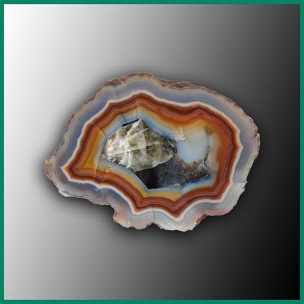 Malawi Agate polished specimen features orange, red, and white banding with a vugg in the center.
