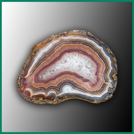 Malawi Agate polished specimen features visible crystal growth and has a flat back. Its banding is in white, red, and yellow-orange.