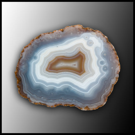 This polished specimen features orange and white banding with translucent blue-gray agate and strong parallax.