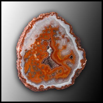 This polished specimen features white, orange, red, and translucent agate with tubes and a druzy-coated vugg.