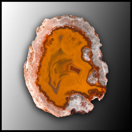 This polished specimen features an outer quartz crystal ring with red and yellow agate inside.